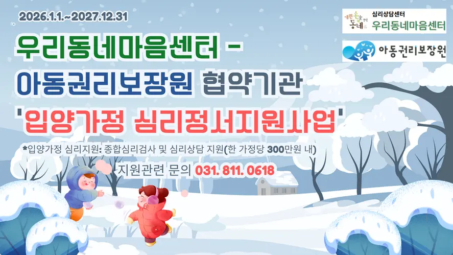 첫째. [업무협약]우리동네마음센터-아동권리보장원 협약기관으로 2026년도부터 입양가정 심리정서지원(풀배터리검사+심리상담)을 합니다.