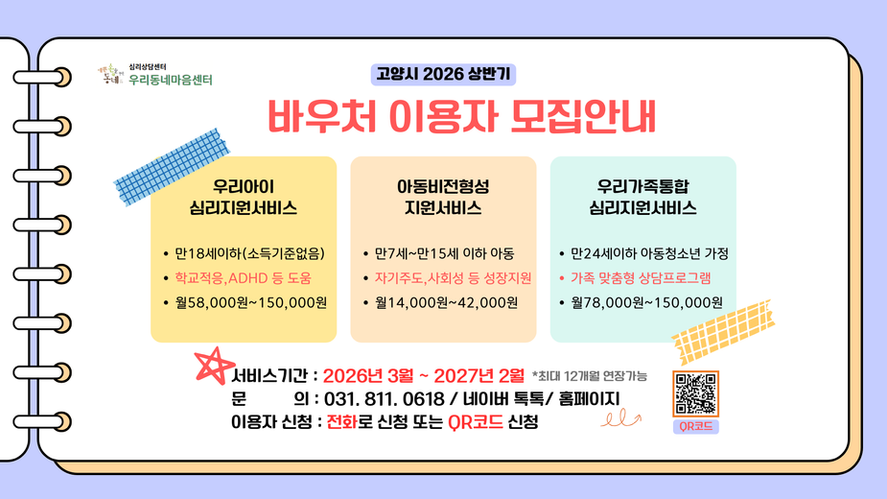 첫째. 2026 상반기 고양시 바우처 신청이 마감되었습니다. 대상자로 선정되신 분들은 본 센터에서 <우리아이심리지원서비스, 아동비전형성지원서비스, 우리가족통합심리지원서비스> 3개 서비스 제공이 가능하오니, 궁금한 점은 문의해주세요! ( TEL 031.811.0618 )